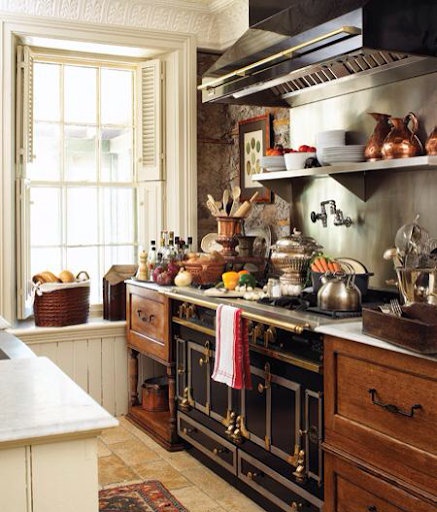 Eclectic Kitchen with French looking stove, walnut cabinets are a must...